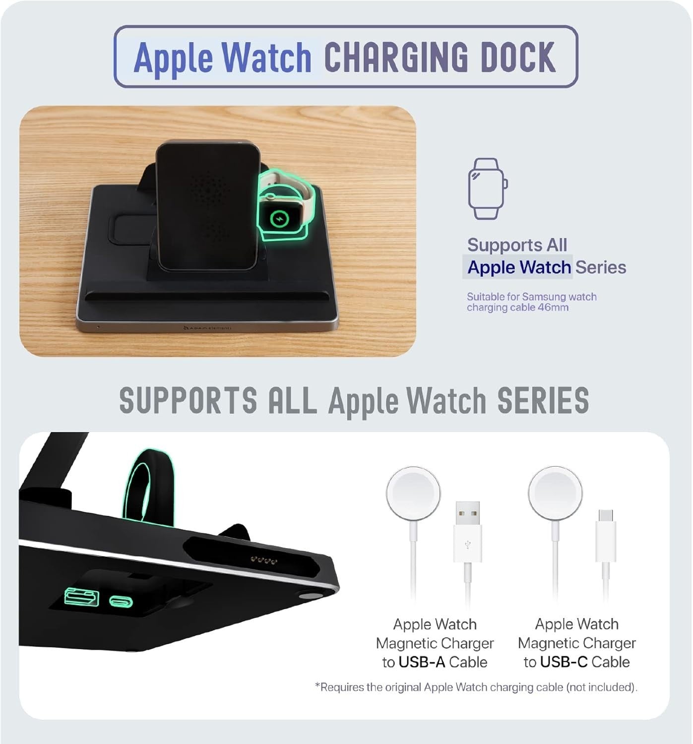 Apple Watch dock : Dedicated 5 V @ 2.5 W charging area