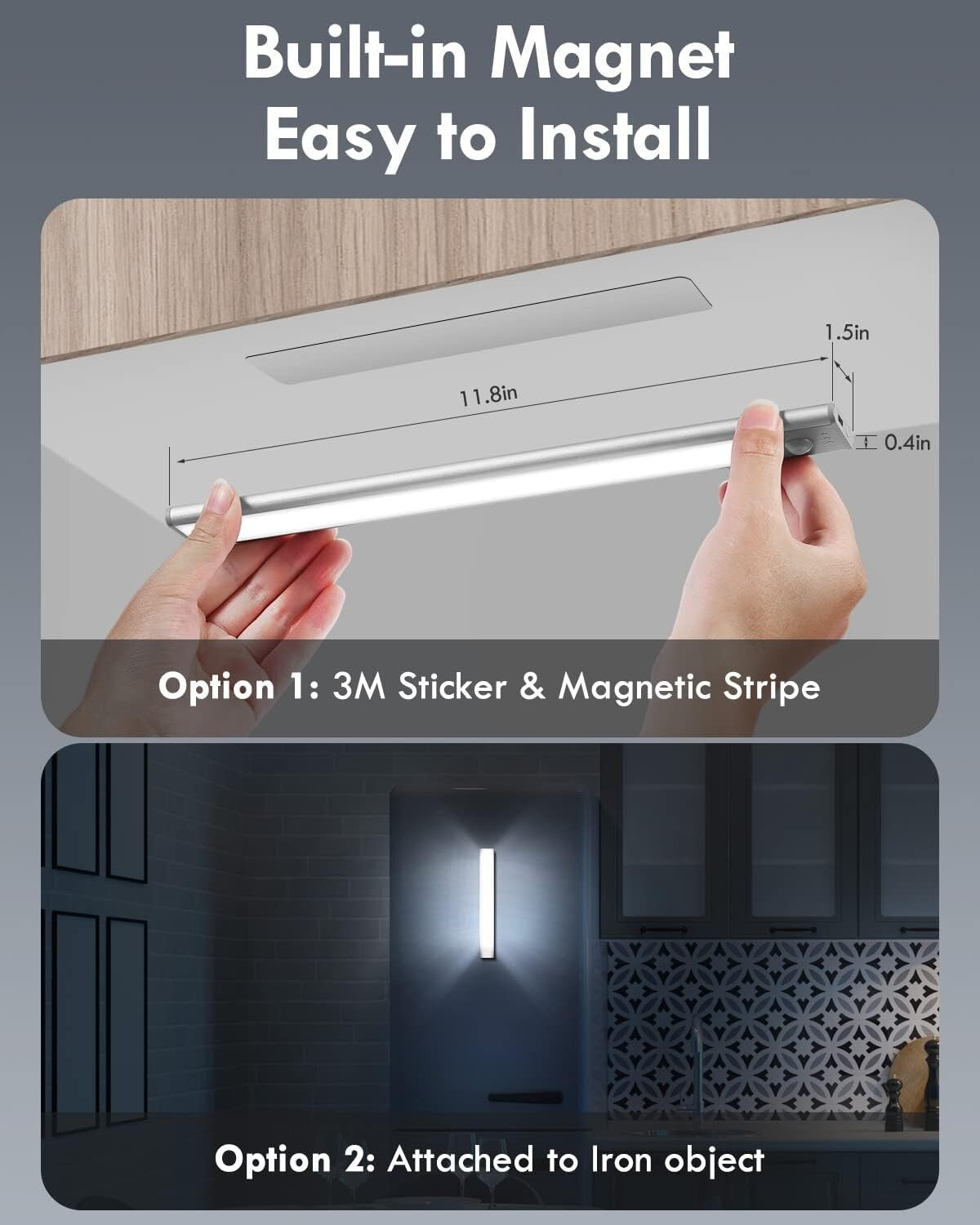 - USB C rechargeable motion sensor light with new sleek design: Well-crafted aluminum body, ultra-thin design with only 0.36-inch thick. This rechargeable battery-powered light allows it to securely snap onto the magnetic strip as well as any iron surface. When you need to charge it, just pop it off the magnetic strip (super easy) and plug it into a USB. The inbuilt 1800mAh lithium battery takes about 2 hours to get a full charge and powers the light for 1.5 to 2 months (if the light is activated five times a day). Super energy efficient, no Alkaline battery is needed.